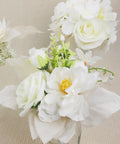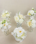 This set of six assorted flower arrangements can be styled as stunning table decorations or elegant bridesmaid bouquets. Their soft white and champagne hues blend effortlessly with both classic and modern themes, creating a refined and harmonious aesthetic.