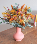 Bursting with vibrant colors and natural textures, the Wildflower Luxe Bouquet is a joyful celebration of wild, untamed beauty. Featuring radiant orange and golden dried blooms, cheerful craspedia, soft pink accents, and lush eucalyptus foliage, this bouquet evokes the charm of a sunlit meadow in full bloom.